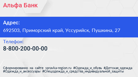 Альфа-Банк по адресу 692503, Приморский край, Уссурийск, Пушкина, 27 в дальнейшем Организация, размещена в следующих категориях: