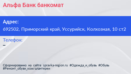 Альфа-Банк, банкомат по адресу 692502, Приморский край, Уссурийск, Колхозная, 10 ст2 в дальнейшем Организация, размещена в следующих категориях: