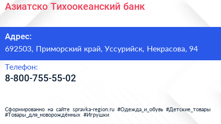 Азиатско-Тихоокеанский банк по адресу 692503, Приморский край, Уссурийск, Некрасова, 94 в дальнейшем Организация, размещена в следующих категориях: