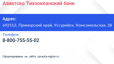 Азиатско-Тихоокеанский банк по адресу 692512, Приморский край, Уссурийск, Комсомольская, 28 в дальнейшем Организация, размещена в следующих категориях: