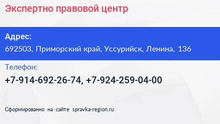 Экспертно-правовой центр по адресу 692503, Приморский край, Уссурийск, Ленина, 136 в дальнейшем Организация, размещена в следующих категориях:
