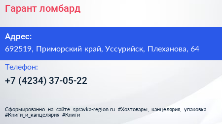 Гарант, ломбард по адресу 692519, Приморский край, Уссурийск, Плеханова, 64 в дальнейшем Организация, размещена в следующих категориях: