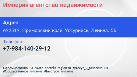 Империя, агентство недвижимости по адресу 692519, Приморский край, Уссурийск, Ленина, 56 в дальнейшем Организация, размещена в следующих категориях: