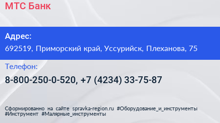МТС-Банк по адресу 692519, Приморский край, Уссурийск, Плеханова, 75 в дальнейшем Организация, размещена в следующих категориях: