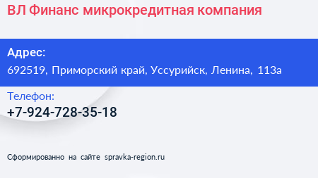 ВЛ-Финанс, микрокредитная компания по адресу 692519, Приморский край, Уссурийск, Ленина, 113а в дальнейшем Организация, размещена в следующих категориях: