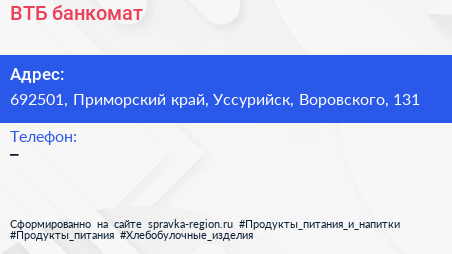 ВТБ, банкомат по адресу 692501, Приморский край, Уссурийск, Воровского, 131 в дальнейшем Организация, размещена в следующих категориях: