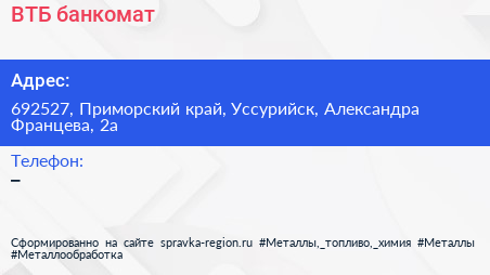 ВТБ, банкомат по адресу 692527, Приморский край, Уссурийск, Александра Францева, 2а в дальнейшем Организация, размещена в следующих категориях: