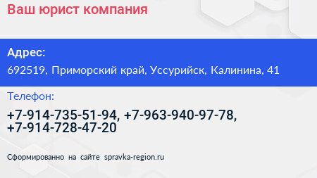 Ваш юрист, компания по адресу 692519, Приморский край, Уссурийск, Калинина, 41 в дальнейшем Организация, размещена в следующих категориях: