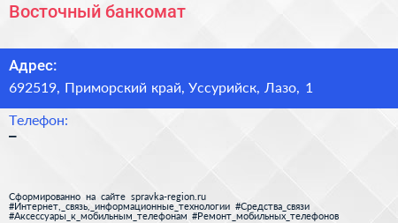Восточный, банкомат по адресу 692519, Приморский край, Уссурийск, Лазо, 1 в дальнейшем Организация, размещена в следующих категориях: