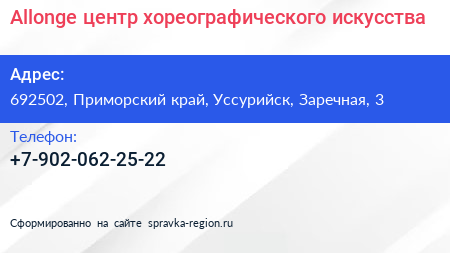 Allonge, центр хореографического искусства по адресу 692502, Приморский край, Уссурийск, Заречная, 3 в дальнейшем Организация, размещена в следующих категориях: