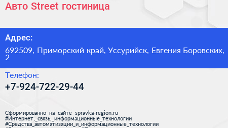 Авто Street, гостиница по адресу 692509, Приморский край, Уссурийск, Евгения Боровских, 2 в дальнейшем Организация, размещена в следующих категориях: