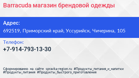 Barracuda, магазин брендовой одежды по адресу 692519, Приморский край, Уссурийск, Чичерина, 105 в дальнейшем Организация, размещена в следующих категориях: