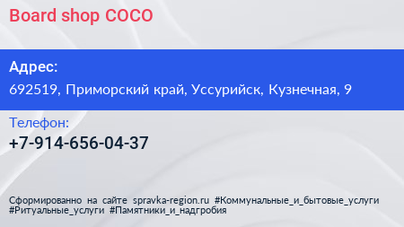 Board shop COCO$ по адресу 692519, Приморский край, Уссурийск, Кузнечная, 9 в дальнейшем Организация, размещена в следующих категориях: