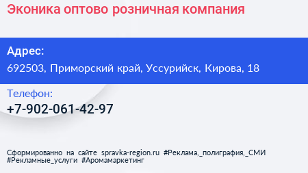 Эконика, оптово-розничная компания по адресу 692503, Приморский край, Уссурийск, Кирова, 18 в дальнейшем Организация, размещена в следующих категориях:
