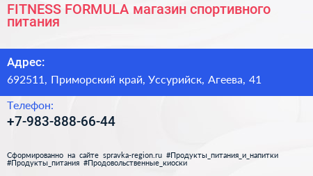 FITNESS FORMULA, магазин спортивного питания по адресу 692511, Приморский край, Уссурийск, Агеева, 41 в дальнейшем Организация, размещена в следующих категориях: