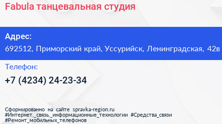 Fabula, танцевальная студия по адресу 692512, Приморский край, Уссурийск, Ленинградская, 42в в дальнейшем Организация, размещена в следующих категориях: