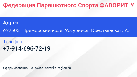 Федерация Парашютного Спорта ФАВОРИТ-У по адресу 692503, Приморский край, Уссурийск, Крестьянская, 75 в дальнейшем Организация, размещена в следующих категориях: