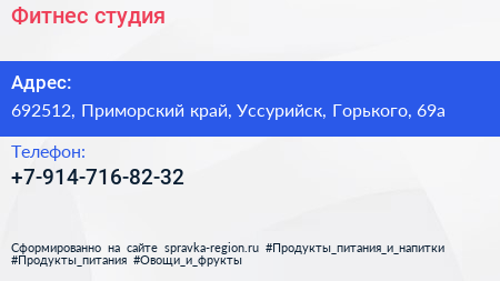 Фитнес-студия по адресу 692512, Приморский край, Уссурийск, Горького, 69а в дальнейшем Организация, размещена в следующих категориях: