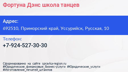Фортуна-Дэнс, школа танцев по адресу 692510, Приморский край, Уссурийск, Русская, 10 в дальнейшем Организация, размещена в следующих категориях: