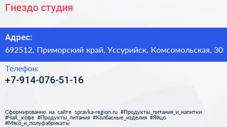 Гнездо, студия по адресу 692512, Приморский край, Уссурийск, Комсомольская, 30 в дальнейшем Организация, размещена в следующих категориях: