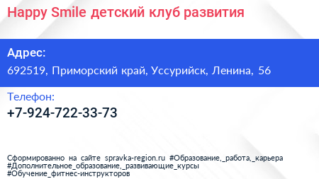 Happy Smile, детский клуб развития по адресу 692519, Приморский край, Уссурийск, Ленина, 56 в дальнейшем Организация, размещена в следующих категориях: