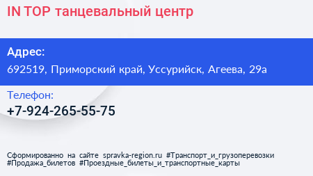 IN TOP, танцевальный центр по адресу 692519, Приморский край, Уссурийск, Агеева, 29а в дальнейшем Организация, размещена в следующих категориях: