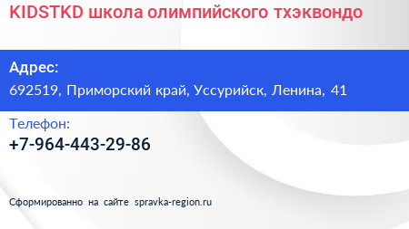 KIDSTKD, школа олимпийского тхэквондо по адресу 692519, Приморский край, Уссурийск, Ленина, 41 в дальнейшем Организация, размещена в следующих категориях: