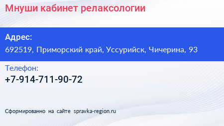 Мнуши, кабинет релаксологии по адресу 692519, Приморский край, Уссурийск, Чичерина, 93 в дальнейшем Организация, размещена в следующих категориях: