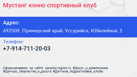 Мустанг, конно-спортивный клуб по адресу 692509, Приморский край, Уссурийск, Юбилейная, 1 в дальнейшем Организация, размещена в следующих категориях: