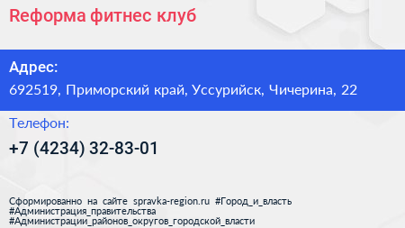 Reформа, фитнес-клуб по адресу 692519, Приморский край, Уссурийск, Чичерина, 22 в дальнейшем Организация, размещена в следующих категориях:
