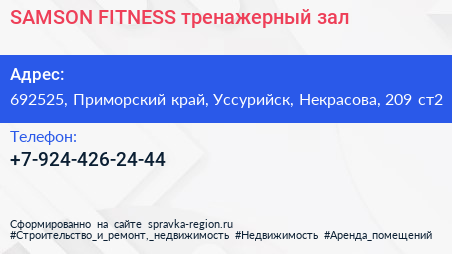 SAMSON FITNESS, тренажерный зал по адресу 692525, Приморский край, Уссурийск, Некрасова, 209 ст2 в дальнейшем Организация, размещена в следующих категориях: