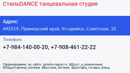 СтильDANCE, танцевальная студия по адресу 692519, Приморский край, Уссурийск, Советская, 31 в дальнейшем Организация, размещена в следующих категориях: