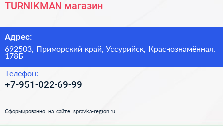 TURNIKMAN, магазин по адресу 692503, Приморский край, Уссурийск, Краснознамённая, 178Б в дальнейшем Организация, размещена в следующих категориях: