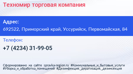 Техномир, торговая компания по адресу 692522, Приморский край, Уссурийск, Первомайская, 84 в дальнейшем Организация, размещена в следующих категориях: