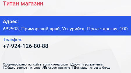 Титан, магазин по адресу 692503, Приморский край, Уссурийск, Пролетарская, 100 в дальнейшем Организация, размещена в следующих категориях: