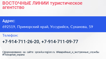 ВОСТОЧНЫЕ ЛИНИИ, туристическое агентство по адресу 692519, Приморский край, Уссурийск, Суханова, 59 в дальнейшем Организация, размещена в следующих категориях: