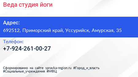 Веда, студия йоги по адресу 692512, Приморский край, Уссурийск, Амурская, 35 в дальнейшем Организация, размещена в следующих категориях: