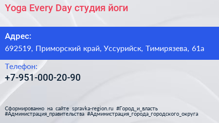 Yoga Every Day, студия йоги по адресу 692519, Приморский край, Уссурийск, Тимирязева, 61а в дальнейшем Организация, размещена в следующих категориях: