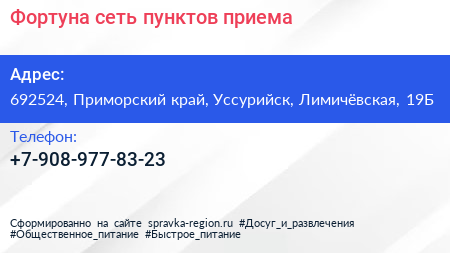 Фортуна, сеть пунктов приема по адресу 692524, Приморский край, Уссурийск, Лимичёвская, 19Б в дальнейшем Организация, размещена в следующих категориях: