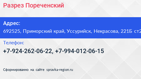 Разрез Пореченский по адресу 692525, Приморский край, Уссурийск, Некрасова, 221Б ст2 в дальнейшем Организация, размещена в следующих категориях: