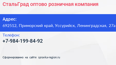 СтальГрад, оптово-розничная компания по адресу 692512, Приморский край, Уссурийск, Ленинградская, 27а в дальнейшем Организация, размещена в следующих категориях: