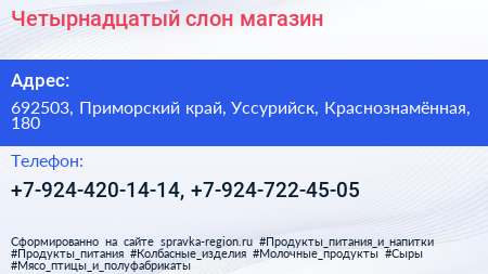 Четырнадцатый слон, магазин по адресу 692503, Приморский край, Уссурийск, Краснознамённая, 180 в дальнейшем Организация, размещена в следующих категориях: