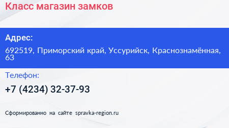 Класс, магазин замков по адресу 692519, Приморский край, Уссурийск, Краснознамённая, 63 в дальнейшем Организация, размещена в следующих категориях:
