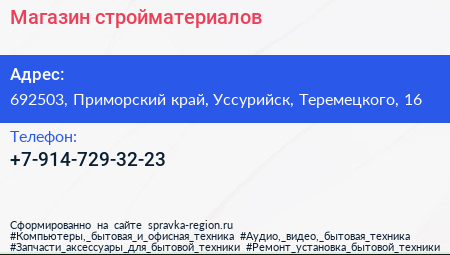 Магазин стройматериалов по адресу 692503, Приморский край, Уссурийск, Теремецкого, 16 в дальнейшем Организация, размещена в следующих категориях: