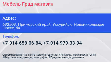 Мебель Град, магазин по адресу 692509, Приморский край, Уссурийск, Новоникольское шоссе, 4а в дальнейшем Организация, размещена в следующих категориях: