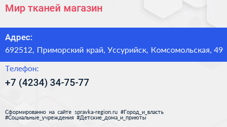 Мир тканей, магазин по адресу 692512, Приморский край, Уссурийск, Комсомольская, 49 в дальнейшем Организация, размещена в следующих категориях: