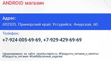 ANDROID, магазин по адресу 692503, Приморский край, Уссурийск, Амурская, 60 в дальнейшем Организация, размещена в следующих категориях: