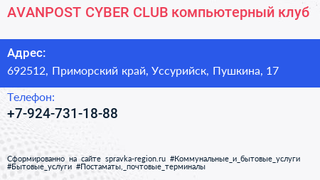 AVANPOST CYBER CLUB, компьютерный клуб по адресу 692512, Приморский край, Уссурийск, Пушкина, 17 в дальнейшем Организация, размещена в следующих категориях: