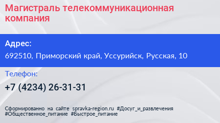 Магистраль, телекоммуникационная компания по адресу 692510, Приморский край, Уссурийск, Русская, 10 в дальнейшем Организация, размещена в следующих категориях: