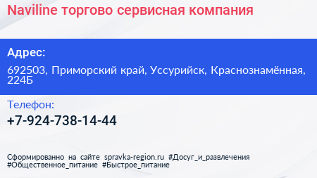 Naviline, торгово-сервисная компания по адресу 692503, Приморский край, Уссурийск, Краснознамённая, 224Б в дальнейшем Организация, размещена в следующих категориях: